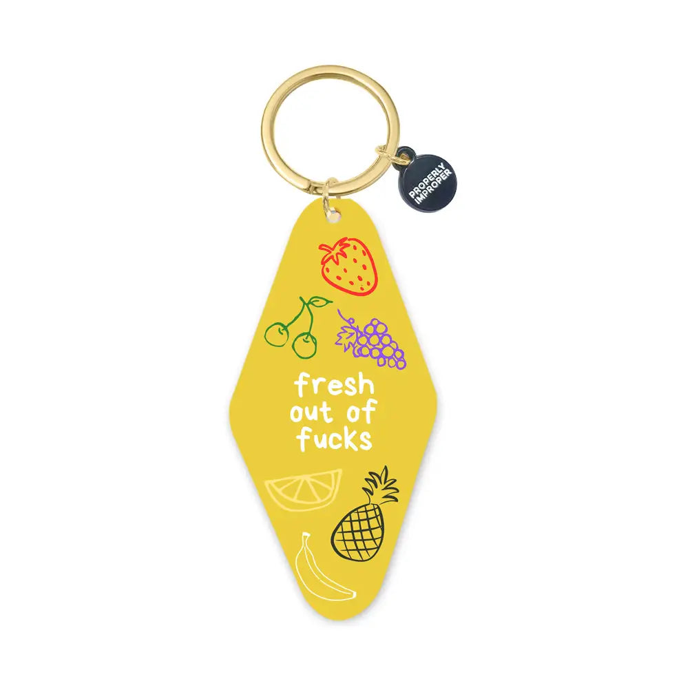 This witty keychain serves up a double dose of humor with its clever "fresh fruit" pun. Set against a cheerful yellow background, delicate fruit outlines—pineapple, strawberry, grapes, cherry, and banana—create a fresh, minimalist design. Perfect for anyone who appreciates a good laugh and doesn't take themselves too seriously. Attach it to your keys, bag, or backpack for a daily dose of playful sass. A compact conversation starter that proves you've got jokes.