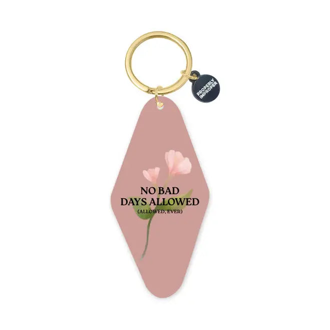 Attach this delightful keychain to your essentials and embrace the "No Bad Days Allowed" philosophy. Painted in soft mauve with a charming flower detail, it's a daily dose of optimism you can take anywhere. Whether dangling from your keys, bag, or backpack, this playful accessory serves as your personal cheerleader, reminding you that every moment is worth celebrating. Small in size, mighty in spirit.